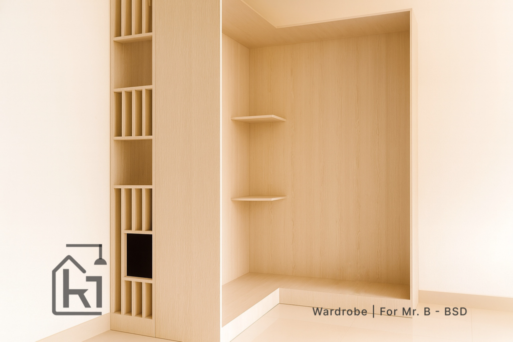 Custom lemari pajangan di BSD menjadi solusi tepat untuk rumah yang ingin memanfaatkan sudut ruangan secara maksimal tanpa membuat area terasa penuh. Lemari pajangan pada proyek ini dirancang khusus untuk menyimpan dan menampilkan koleksi secara rapi, sekaligus menjaga tampilan ruangan tetap bersih dan modern.